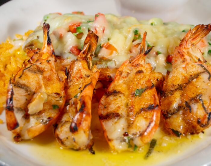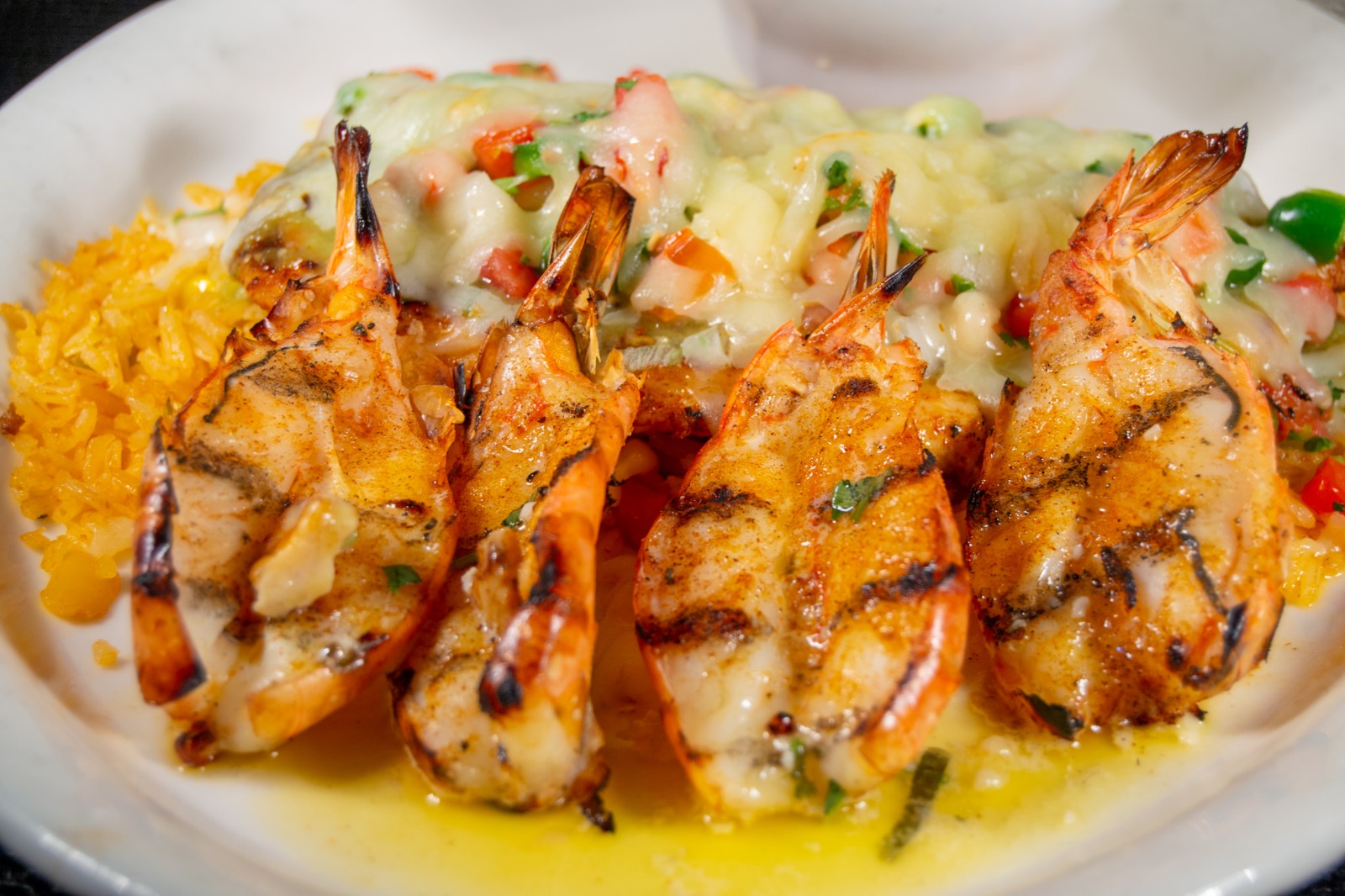 Grilled chicken w/ shrimp and green sauce on top melted…