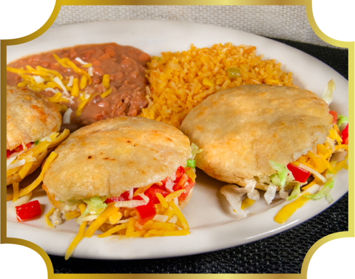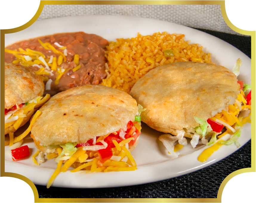 (3) gorditas w/ cheese, tomatoes, lettuce, rice and beans. >…