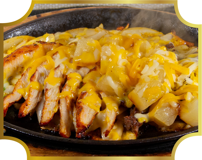 Sizzling fajitas laid on sauteed onions, bell peppers,